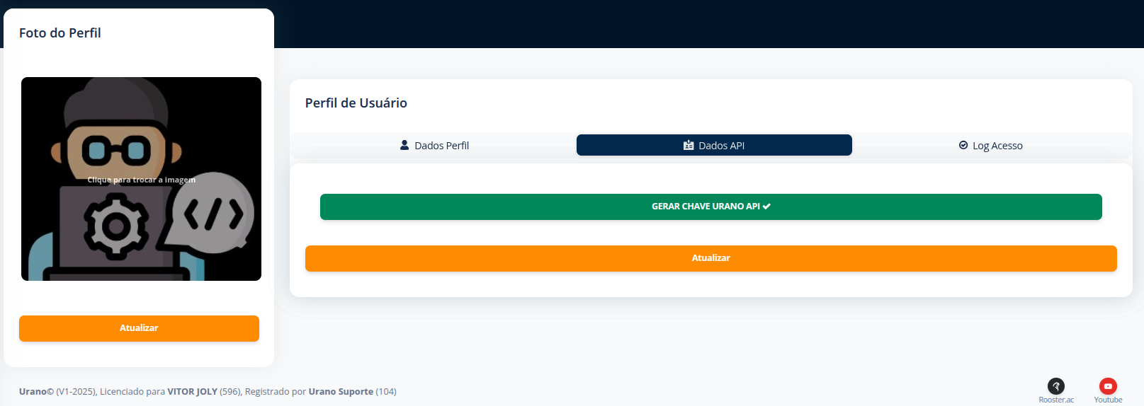 Após isso, vá até a aba "Dados API" e clique no botão "GERAR CHAVE URANO API".